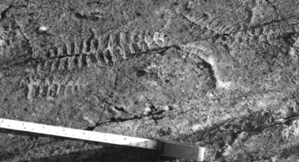 Fig. 5 - 4: Several individuals of Spindle-shaped animal and one specimen of leaf-shaped object are seen in the photograph. The main body of the leaf-shaped object is compressed and reduced in width. The spindle-shaped animals are without a definite outline. |